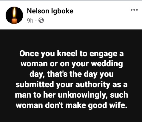 "Once you kneel to engage a woman or on your wedding day, that's the day you submitted your authority as a man to her unknowingly, such woman don;t make good wife."