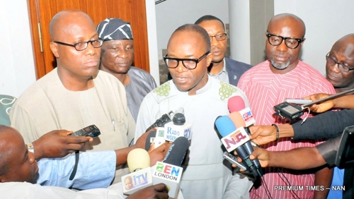 From Left: President, Petroleum And Natural Gas Senior Staff Association Of Nigeria (PENGASSAN)Minister Of State For Petroleum, Mr Ibeh Kachikwu And President, Nigeria Union Of Petroleum And Natural Gas Workers (NUPENG) Mr Igwe Achese Addressing State House Correspondents After Their Meeting With President Buhari At The Presidential Villa In Abuja On Wednesday