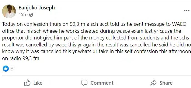 “Today on confession thurs on 99,3fm a sch acct told us he sent message to WAEC office that his sch where he works cheated during wasce exam last yr cause the proprietor did not give him part of the money collected from students and the schs result was cancelled by waec this yr again the result was cancelled he said he did not know why it was cancelled this year whats ur take in this self-confession this afternoon on radio 99,3 fm.”