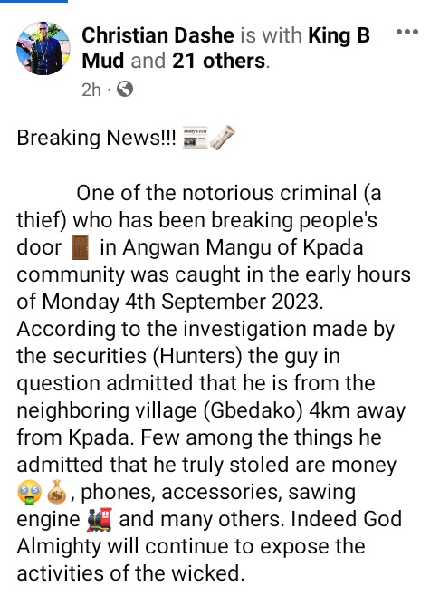 “One of the notorious criminal (a thief) who has been breaking people's door in Angwan Mangu of Kpada community was caught in the early hours of Monday 4th September 2023. According to the investigation made by the securities (Hunters) the guy in question admitted that he is from the neighboring village (Gbedako) 4km away from Kpada. Few among the things he admitted that he truly stole are money, phones, accessories, sawing engine and many others. Indeed God Almighty will continue to expose the activities of the wicked.” Dashe wrote on Facebook