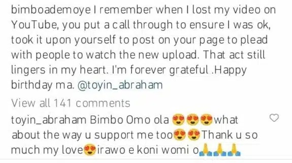 Toyin replied to the caption with, “Bimbo omo ola; what about the way u support me too. Thank you so much my love. Irawo e koni womi o.”