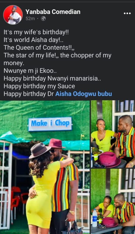Sharing loved up photos, Yanbaba described his wife as the Queen of content, the star of his life and the “chopper of his money”.