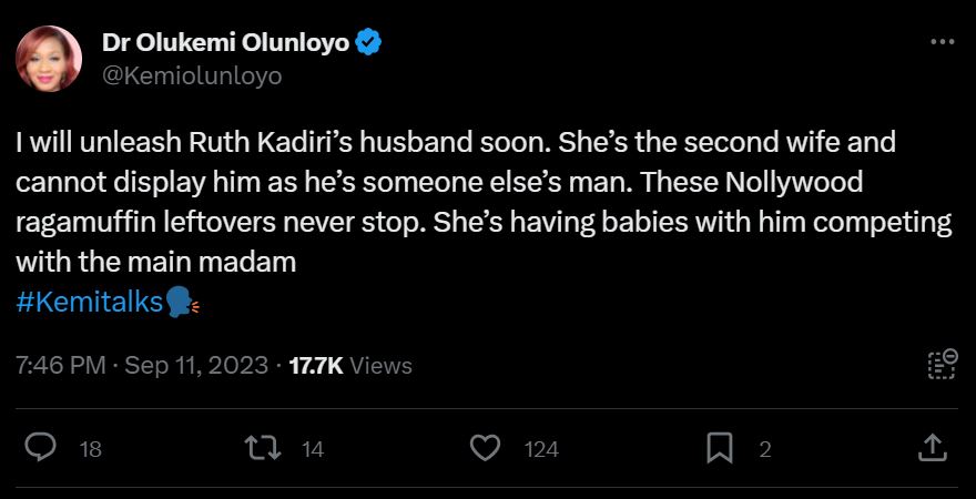 “I will unleash Ruth Kadiri’s husband soon. She’s the second wife and cannot display him as he’s someone else’s man. These Nollywood ragamuffin leftovers never stop. She’s having babies with him competing with the main madam”.