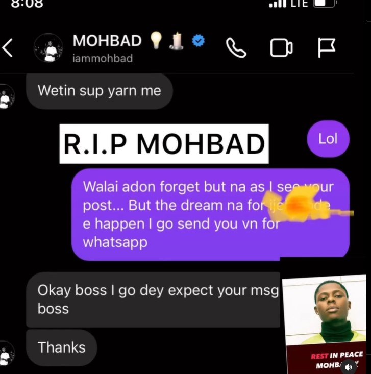 Shebi I still Buzz you sey shey make we link up tomorrow and was waiting for your reply not knowing your last reply to me was gonna be the last , I still dey wait make you post the freestyle i do for your challenge MOHBAD…. Your track “ASK ABOUT ME”.=
