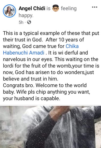 “This is a typical example of those who put their trust in God. After 10 years of waiting, God came true for Chika Habenuchi Amadi. It is wonderful and Marvelous in our eyes. This waiting on the lord for the fruit of the womb, your time is now, God has arisen to do wonders, just believe and trust in him. Congrats bro. Welcome to the world baby. Wife pls chip anything you want, your husband is capable.,” she wrote.