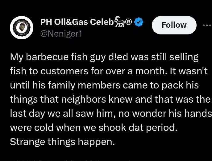 He wrote: “My barbecue fish guy died but was still selling fish to customers for over a month. It wasn’t until his family members came to pack his things that neighbors knew, and that was the last day we all saw him. No wonder his hands were cold when we shook that period. Strange things happen.”