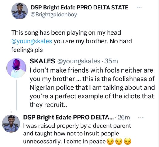 Skales, the popular Nigerian singer, and Bright Edafe, the Delta police PRO, on Sunday morning September 17, had another clash on X.