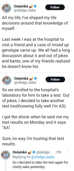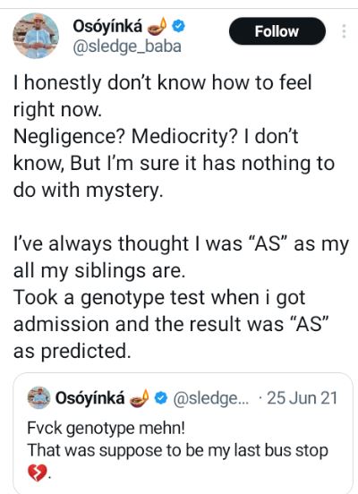 Taking to X yesterday, to address the entire situation, he wrote; “I honestly don’t know how to feel right now. Negligence? Mediocrity? I don’t know, But I’m sure it has nothing to do with mystery. I’ve always thought I was “AS” as my all my siblings are. Took a genotype test when i got admission and the result was “AS” as predicted.”