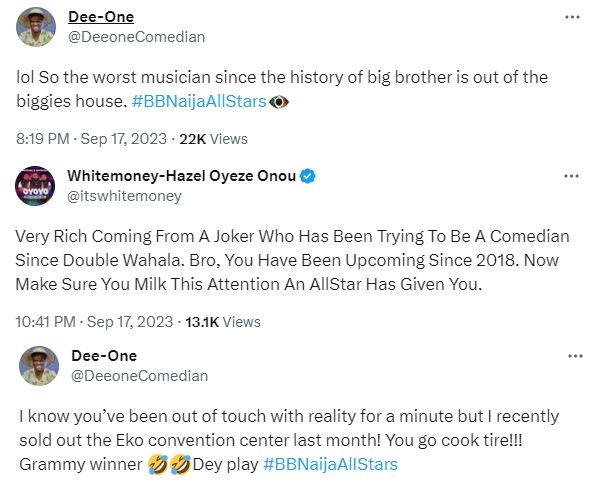 It all started when Dee-one took to the microblogging app to mock Whitemoney after he was evicted from the BBNaija All Stars house.