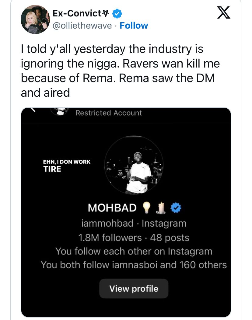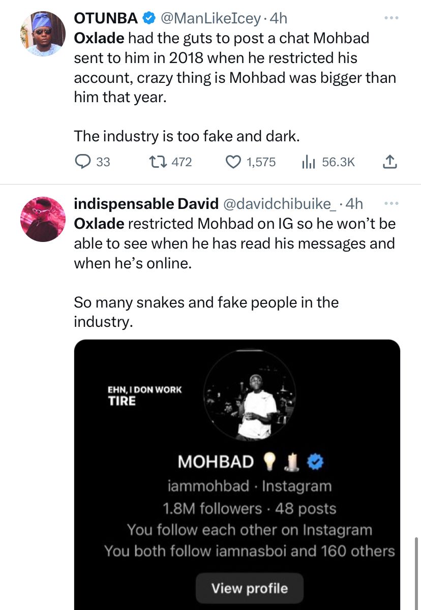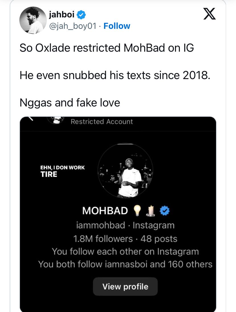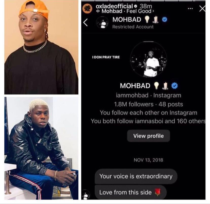 However, the screenshot shared by the singer, shows that Mohbad’s account was restricted by Oxlade.