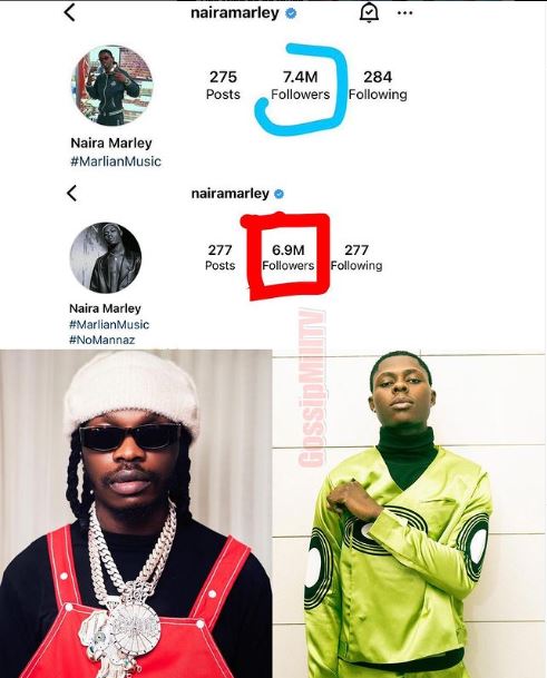 Before losing over 500,000 followers, Naira Marley had 7.4 million followers. It has now reduced to 6.9 million.