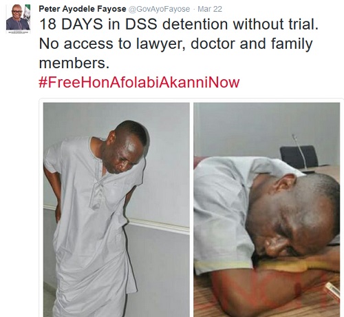 Lawmaker and member of the Ekiti state House of Assembly, Afolabi Akanni, who was arrested by the Department of State Services (DSS), and spent 18 days in their custody, arrived Ado-Ekiti on Thursday, March 24th.