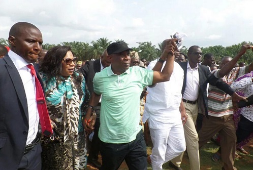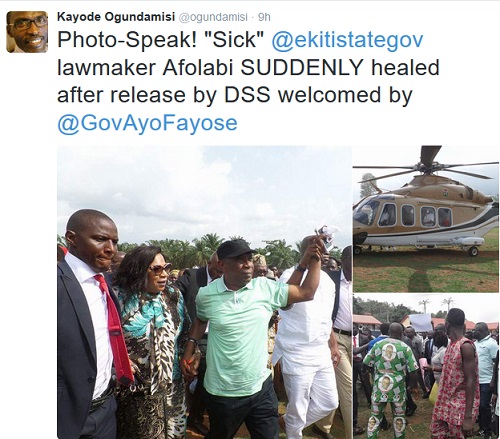 Governor Ayodele Fayose was accompanied by other state officials to receive the lawmaker who arrived aboard a helicopter at about 3:38pm and landed at Christ’s School playing ground in Ado Ekiti.