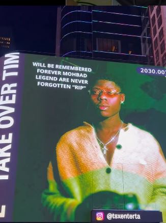 Late Nigerian singer, Ilerioluwa Aloba aka Mohbad's face has been showcased at the world-famous Times Square Billboard in New York.