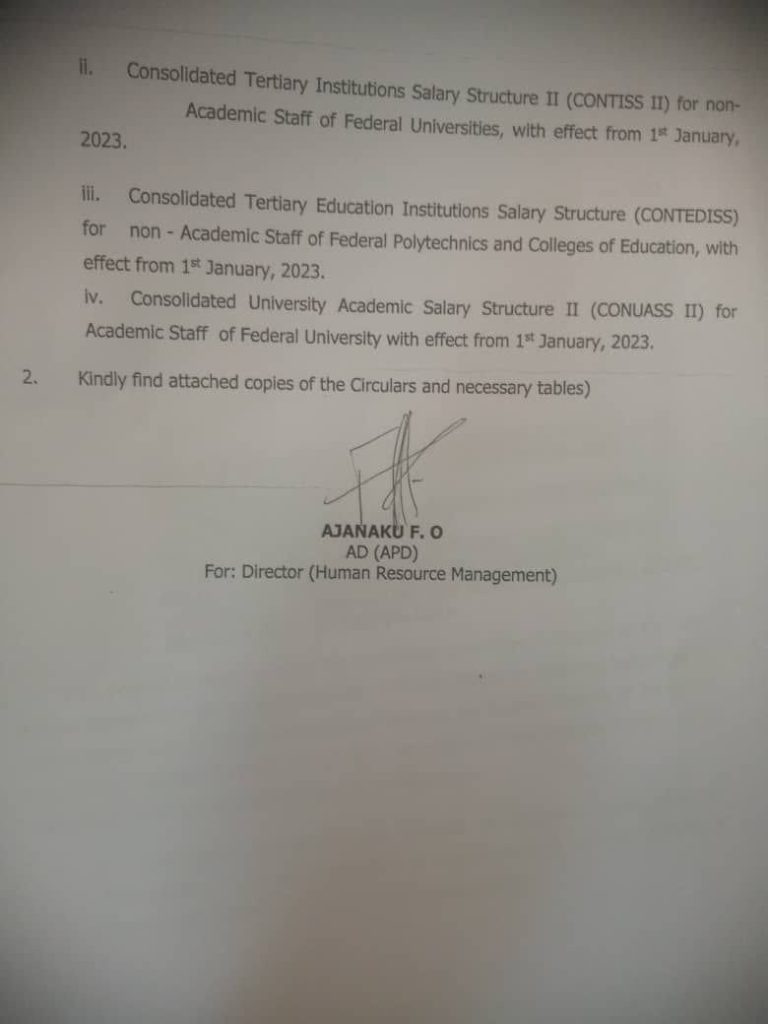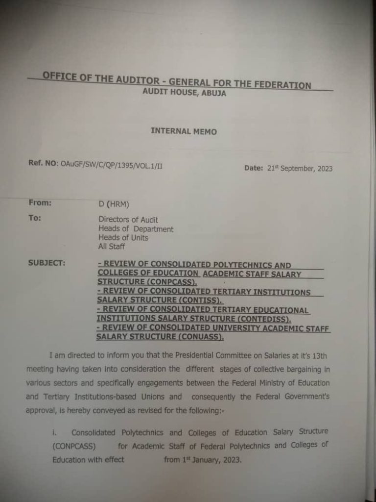 Consolidated Polytechnics and Colleges of Education Salary Structure (CONPCASs) for Academic Staff of Federal Polytechnics and Colleges of Education with effect from 1 January, 2023,” part of the letter said.