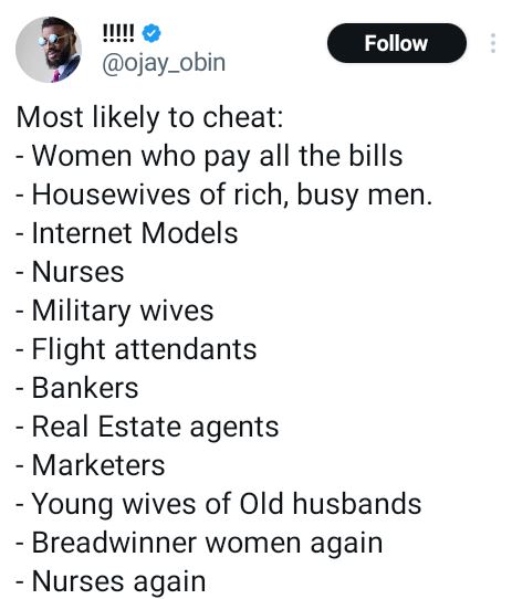 A Nigerian man, Ojay Obin, has taken to 'X' formerly Twitter to make a list of women likely to be unfaithful to their spouses.