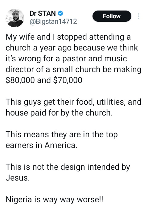 “My wife and I stopped attending a church a year ago because we think it’s wrong for a pastor and music director of a small church be making $80,000 and $70,000 This guys get their food, utilities, and house paid for by the church. This means they are in the top earners in America. This is not the design intended by Jesus. Nigeria is way way worse!! The church should be a place where people get lifted up, cared for, and looked after,” he said.