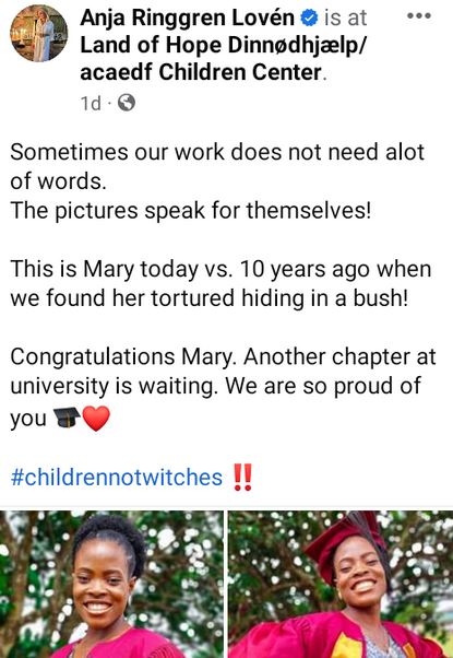 “Sometimes our work does not need a lot of words. The pictures speak for themselves! This is Mary today vs. 10 years ago when David Emmanuel Umem found her tortured hiding in a bush! Congratulations Mary. Another chapter at university is waiting. We are so proud of you,” she wrote.
