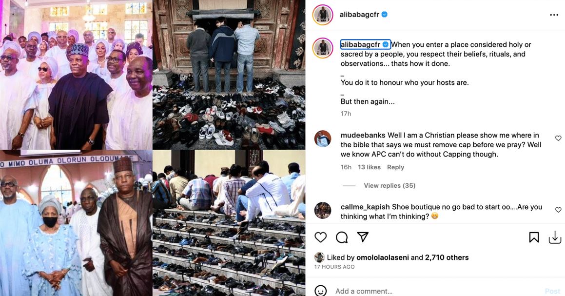 Ali Baba took to his Instagram page to share a photo collage of Shettima at a church event alongside Muslims observing their prayer.