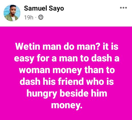 A Nigerian man, Samuel Sayo has taken to Facebook to make a revelation about his fellow men.