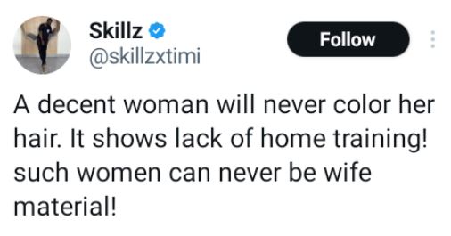 “A decent woman will never color her hair. It shows lack of home training! such women can never be wife material,” he said on Tuesday.