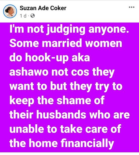 The founder of RantHQ, Suzan Ade Coker, has taken to Facebook to explain why some married women are engaged in transactional s3x.