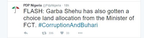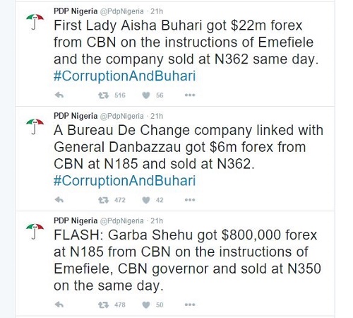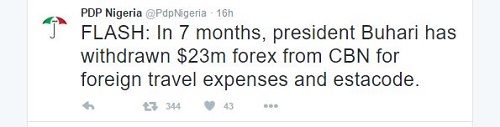 The Peoples Democratic Party has leveled allegations of cheating, fraud and stealing on president Muhammadu Buhari, Aisha Buhari, Shehu Garba and many others as it accused them of using the Central Bank to make profits. In a number of tweets using the official twitter handle @PdpNigeriaOfficial, the party alleged that "In 7 months, president Buhari has withdrawn $23m forex from CBN for foreign travel expenses and estacode."