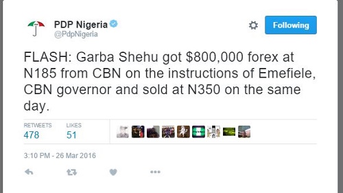 It also said that "First Lady Aisha Buhari got $22m forex from CBN on the instructions of Emefiele and the company sold at N362 same day. " and accused Garba Shehu that he "got $800,000 forex at N185 from CBN on the instructions of Emefiele, CBN governor and sold at N350 on the same day."