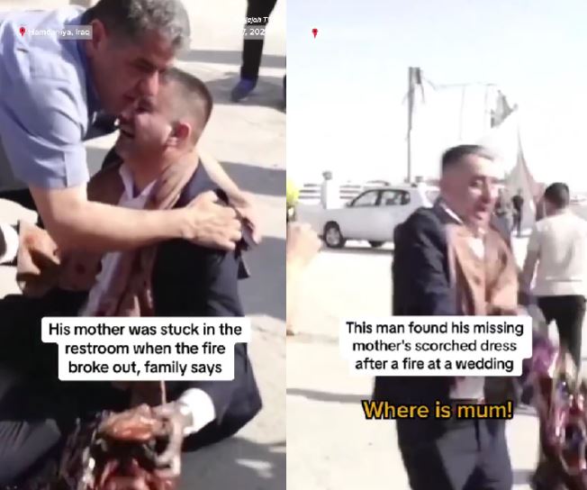A heartbreaking video has captured the moment a man broke down in tears after he discovered that his mother was burnt to death while attending a wedding in Iraq.