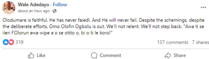 “Olodumare is faithful. He has never failed. And He will never fail. Despite the schemings, despite the deliberate efforts, Omo Olofin Ogbolu is out. We’ll not relent. We’ll not step back,” Adedayo posted on his Facebook page while announcing his freedom.