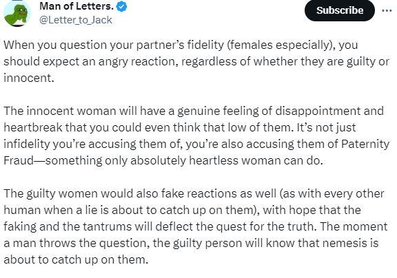 He stated that a sincere woman will be heartbroken that her partner doesn't trust her, while one who is guilty will fake reactions and tantrums with hopes that it will deflect the quest for the truth.