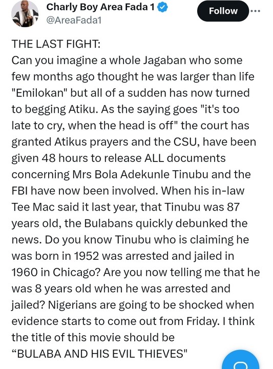 Can you imagine a whole Jagaban who some few months ago thought he was larger than life "Emilokan" but all of a sudden has now turned to begging Atiku. As the saying goes "it's too late to cry, when the head is off" the court has granted Atikus prayers and the CSU, have been given 48 hours to release ALL documents concerning Mrs Bola Adekunle Tinubu and the FBI have now been involved. When his in-law Tee Mac said it last year, that Tinubu was 87 years old, the Bulabans quickly debunked the news. Do you know Tinubu who is claiming he was born in 1952 was arrested and jailed in 1960 in Chicago? Are you now telling me that he was 8 years old when he was arrested and jailed? Nigerians are going to be shocked when evidence starts to come out from Friday. I think the title of this movie should be
