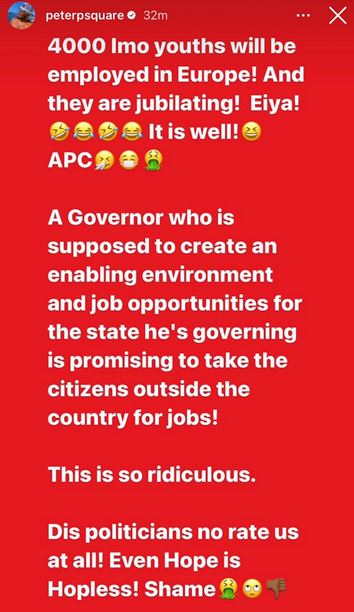 Popular Nigerian singer, Peter Okoye has taken a swipe at the Gov of Imo State, Hope Uzodinma for announcing that he would help 4,000 indigenes of Imo State secure jobs in Europe and Canada by December 2023.