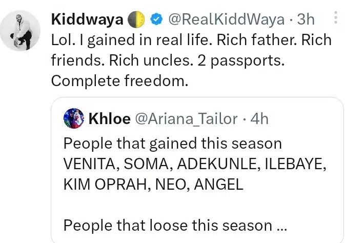 In reaction, Kiddwaya said that he has gained a lot of things in real life, including a rich father, uncle, friends and two passports.