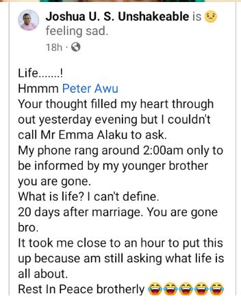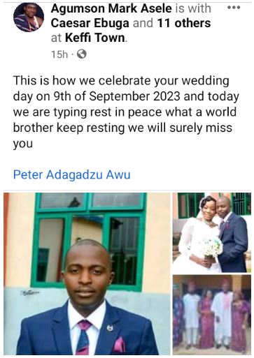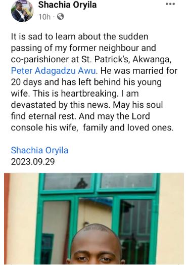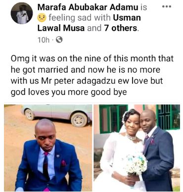 Peter Andrew Adagadzu, a Nigerian man, has died just 20 days after he got married.
