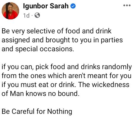 "If you can, pick food and drinks randomly from the ones which aren't meant for you if you must eat or drink. The wickedness of Man knows no bound. Be Careful for Nothing,” she wrote.