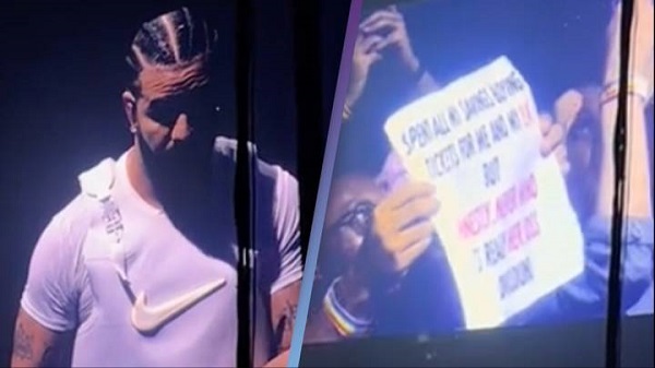 As Drake was performing, he noticed a fan in the crowd holding up a sign that caught his attention.