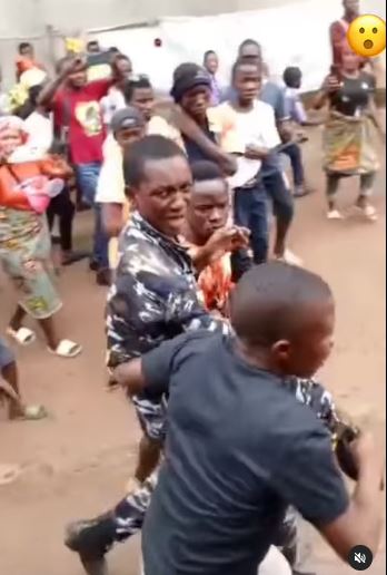 In the video, the police officer was seen being dragged by the crowd. Some others were seen slapping and beating him.