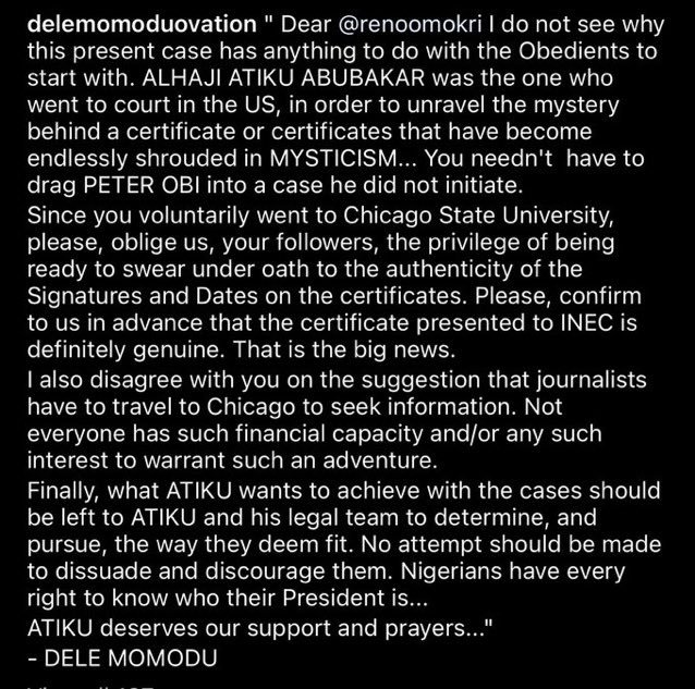 In a social media post, Dele Momodu warned Reno Omokri to stop attacking Peter Obi over Chicago state university controversy instituted by Atiku Abubakar.