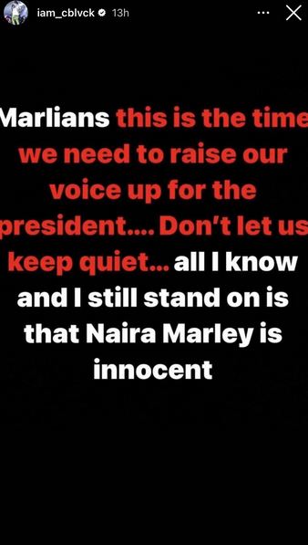 Taking to his Instagram story, Cblvck urged Marlian fans to speak up in support of Naira Marley, before claiming that his label boss is innocent of allegations that he had a hand in Mohbad's death.