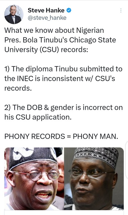 A university professor of Economics in the United States, Steve Hanke has reacted to the controversy surrounding President Bola Tinubu's academic credentials.