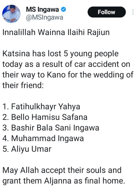 A fatal accident has claimed the lives of five young men along Katsina-Kano road.