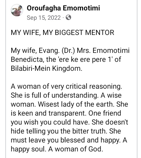 "My wife, Evang. (Dr.) Mrs. Emomotimi Benedicta, the 'ere ke ere pere 1' of Bilabiri-Mein Kingdom,” he wrote.