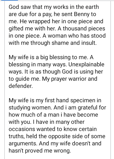 "God saw that my works in the earth are due for a pay, he sent Benny to me. He wrapped her in one piece and gifted me with her. A thousand pieces in one piece. A woman who has stood with me through shame and insult.