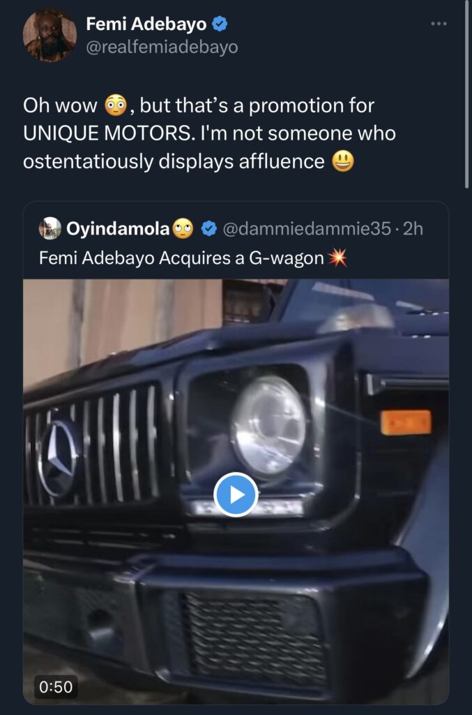 Nollywood actor and producer, Femi Adebayo has denied purchasing a brand new G-wagon.