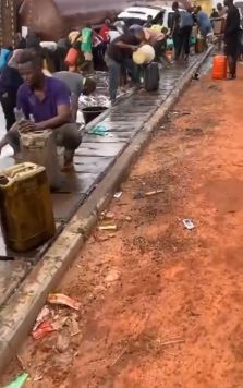 A viral video has captured residents gathered with buckets and bowls to scoop fuel from the roadside after a tanker carrying diesel fell and spilt its contents.