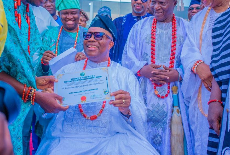 Akpabio was conferred with the title of Aare Fiwagboye of Yewaland, by the Olu and Paramount Ruler of Yewaland Oba (Dr) Kehinde Gbadewole Olugbenle.
