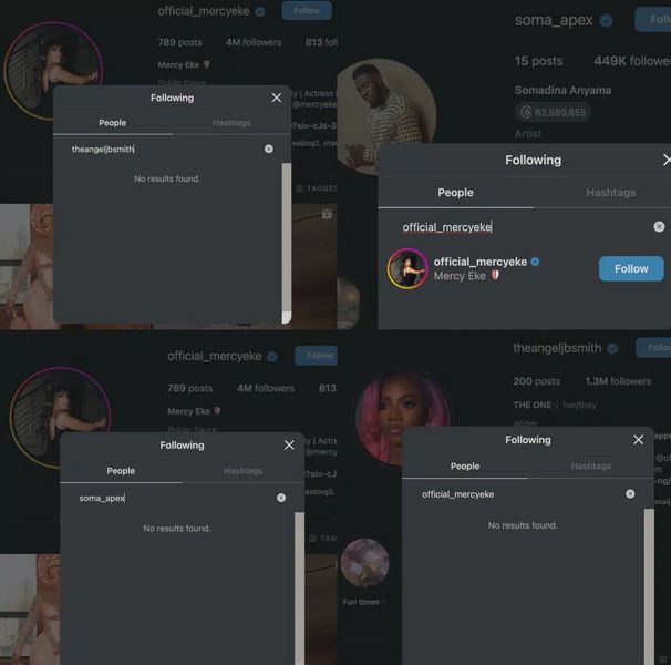 However, an unexpected development came to light yesterday evening when fans noticed that Mercy Eke had unfollowed Angel and Soma on her Instagram account.