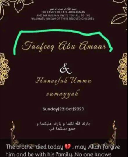 The wedding was supposed to hold on Oct. 22, 2023. Sadly, the groom died a week prior and the wedding was cancelled on Saturday, Oct. 14.