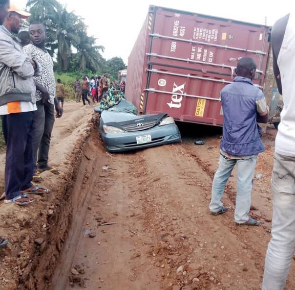 His vehicle was said to have been stuck at a bad portion of the Etche-Ngo Okpala road when the container fell off a truck and crushed him
